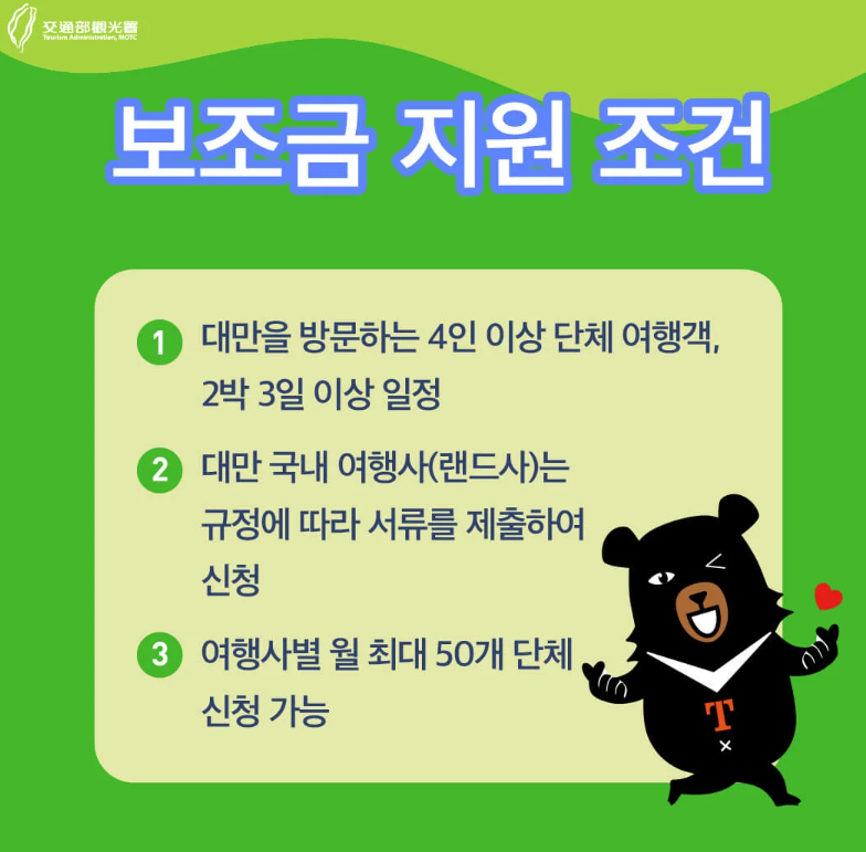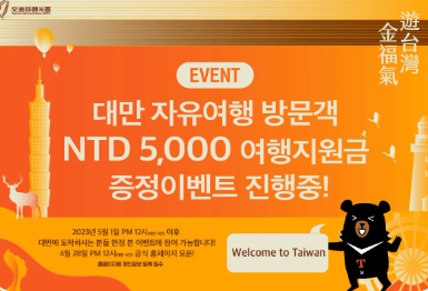 - 지원 기간: 2023년 5월 1일 ~ 2025년 6월 30일 신청처(https://www.taiwantour.or.kr/)
