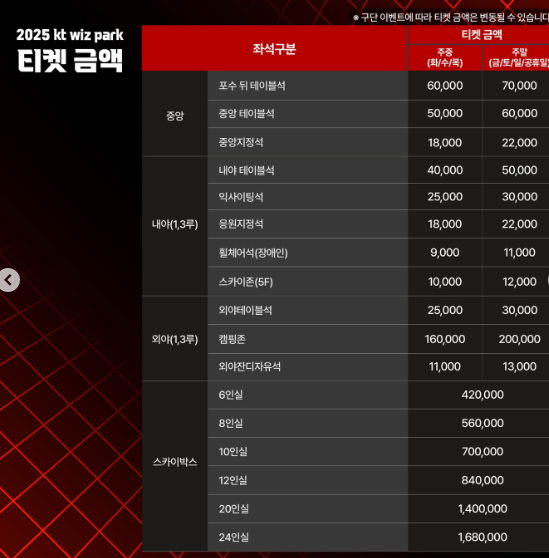 | 좌석구역 | 평일 | 주말 | 특전 |